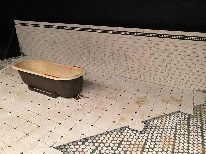 One of my main tasks on this show was the bathtubs. After weeks of trying to get the rust off and install the claw feet for each tub, the team ran into new issues. The feet would not hold up the bathtubs and some of the feet did not even fit. I created a quick design for cradles that allowed the bathtubs to sit on the floor and be stable for the actors without indenting the painted floor. There were three sets of two cradles made for each tub specifically focused on the curvature of the base of each tub. The flooring is sheets of luan with a special texture no-slip paint applied in different stencils. Then sand was sprinkled on top to guarantee the actors would not slip when they got out of their tubs.